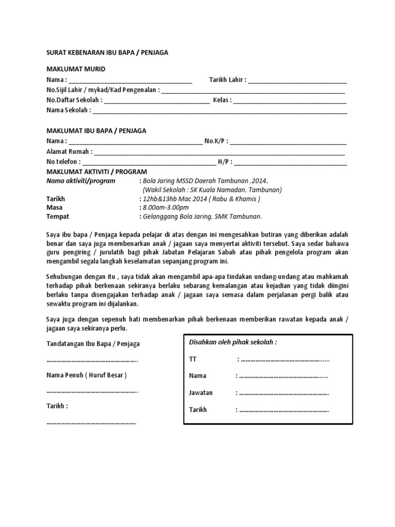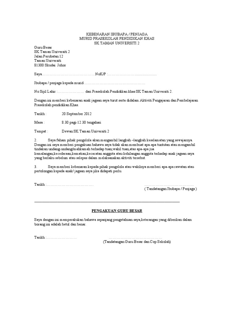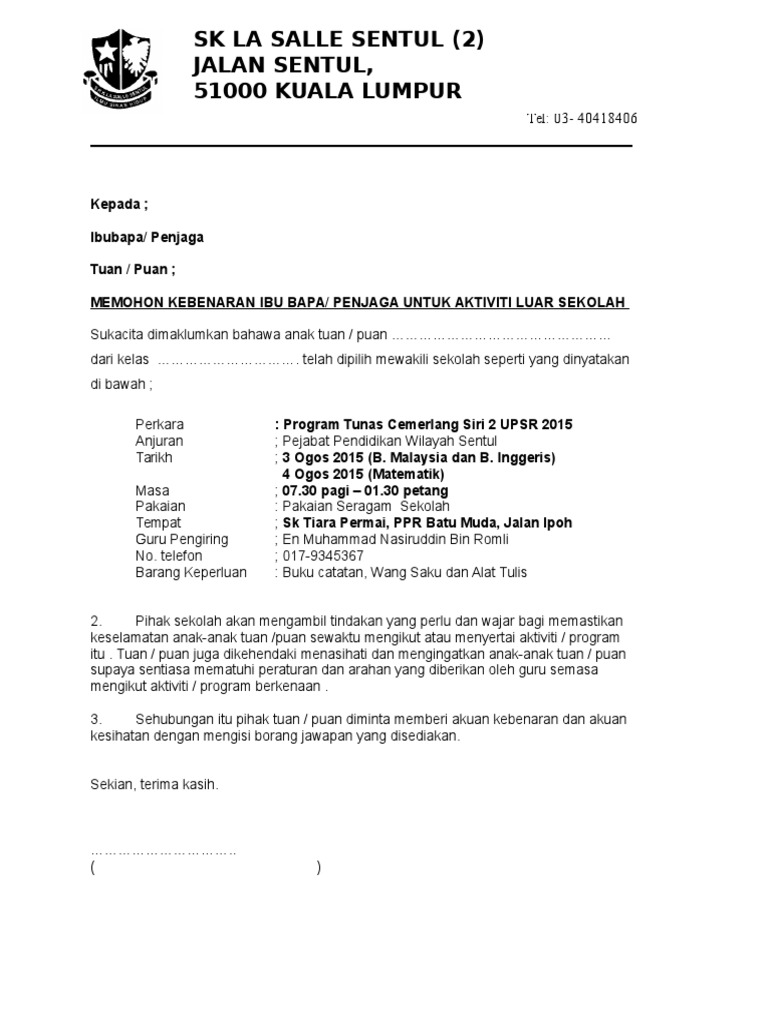 Use the download button below or simple online reader. Contoh surat kebenaran bawa murid untuk aktiviti luar sekolah atau luar waktu p n p. Jika ada sebarang pertanyaan, sila hubungi guru yang bertugas iaitu muhammad saifullah salleh no. Surat kebenaran ibu bapa kpd anak menukar mod kursus di kolej matrikulasi. Apabila surat wakil ini dikemukan semasa membuat urusan, ia dijadikan sebagai bukti bahawa dokumen atau urusan.