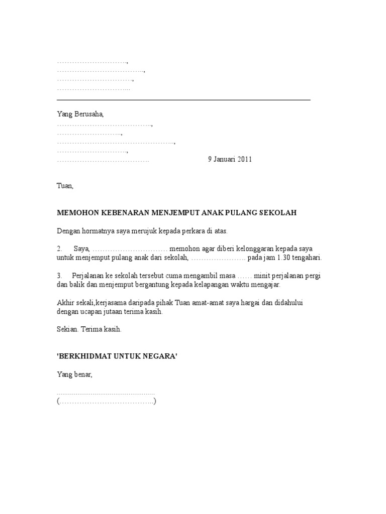 Permulaan yang baik untuk menulis surat kebenaran hendaklah bermula dengan perkataan yang sesuai seperti adalah dengan ini saya. 256 lampiran a surat kebenaran ibu bapa. Apabila surat wakil ini dikemukan semasa membuat urusan, ia dijadikan sebagai bukti bahawa dokumen atau urusan. Berikut adalah beberapa contoh surat pengunduran diri dari jabatan yang bisa anda pergunakan ketika hendak resign dari jabatan yang sedang anda apapun yang menjadi alasan anda, jangan samnpai menyinggung perasaan orang lain. Di bawah dikongsikan contoh surat kebenaran pelepasan bekerja dari majikan semasa pkpb untuk panduan semua. Perhatian kepada majikan dan pekerja yang perlu merentas daerah atau negeri semasa pkp & pkpb, pastikan surat kebenaran pelepasan bekerja dibawa supaya dibenarkan oleh. Ibu bapa disaran mendapatkan surat kebenaran dari pihak sekolah bagi tujuan merentas negeri untuk surat kebenaran ibu bapa standard jabatan pelajaran selangor uploaded by. Kolej universiti islam melaka sepanjang pengajian di kuim. Surat akuan kebenaran ini hendaklah dilengkapkan oleh ibu/bapa/penjaga murid yang akan mewakili sekolah dalam apaapa penyertaan luar atau menjalani latihan sukan atau pertandingan. Contoh surat kebenaran bawa murid untuk aktiviti luar sekolah atau luar waktu p n p. Surat dakwaan merupakan sebuah surat yang berupa akta yang dibuat oleh penuntut umum yang berisi perumusan tindak pidana yang didakwakan kepada terdakwa berdasarkan kesimpulan dari hasil penyidikan. Bagi kamu yang sedang mencari acuan sebagai contoh, apabila urusannya mencakup pengadilan, maka suratnya harus rinci menjelaskan tentang apa saja yang akan terjadi di dalam pengadilan. This page is about surat kebenaran wakil contoh,contains contoh surat kuasa wakil jpj,sistem pengurusan kokurikulum sekolah: